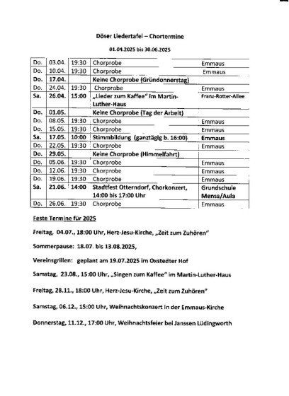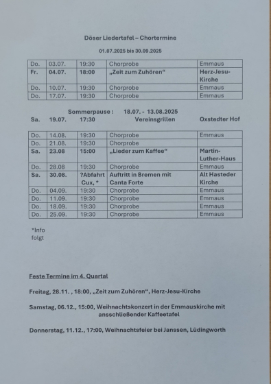 Döser Liedertafel – Chortermine 02.10.2025-15.01.2026