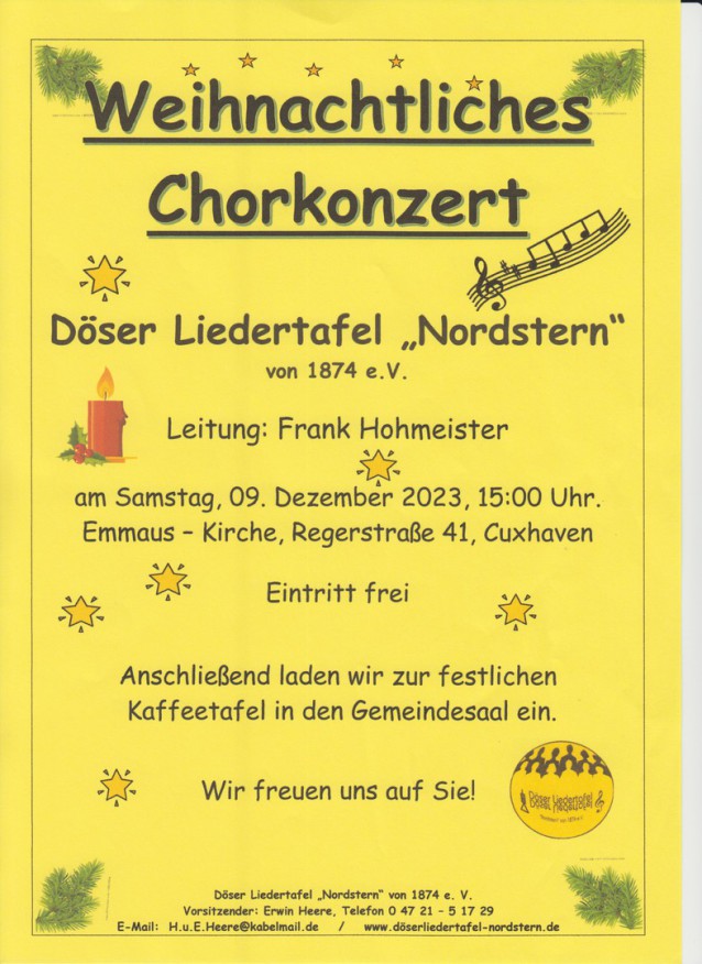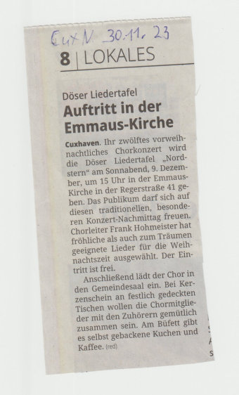 Ankündigung: Auftritt am 09.12.2023 in der Emmaus-Kirche um 15:00 in den Cuxhavener Nachrichten